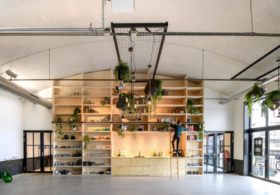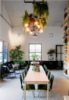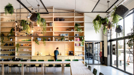 De industriële haven sfeer is bij beide gebouwen zowel binnen als buiten goed te voelen en wordt versterkt door de betonnen vloeren en het hoge gebogen betonnen plafond of het Staal van de wanden. We gebruiken binnen zo veel mogelijk natuurlijke materialen en we houden van bloemen en planten, dus ook die zie je terug.