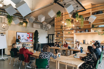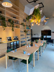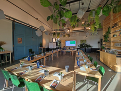Vergaderen, presenteren, workshops, trainingen, borrelen, dineren: het kan allemaal in deze creatieve ruimte. We hebben veel gebruik gemaakt van hout om de muren te bekleden, waardoor deze zaal een heel industriële en toch gezellige sfeer heeft.