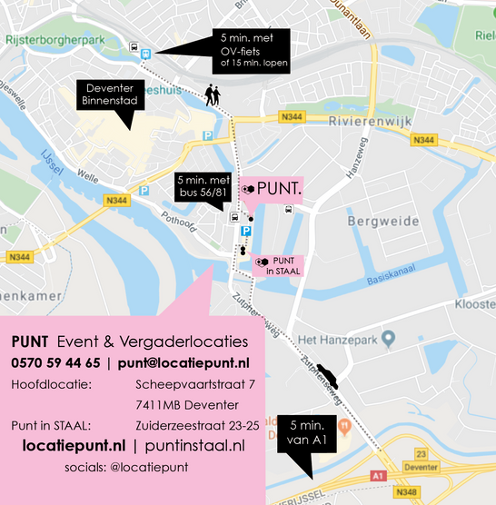 Onze vergaderruimtes zitten aan de Zuiderzeestraat 23-25. Op een steenworp afstand van onze evenlocatie PUNT. Beide op nog geen 2 minuten lopen van elkaar.